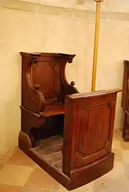 - Les Stalles, qui datent du XVIIIe siècle, sont inscrites[14] à titre d'objet. Il y a deux ensembles de deux stalles sans agenouilloir et une stalle qui en comporte un. Elles sont ornées sur les parcloses de volutes et d'acanthes et les miséricordes sont ornées de culots en feuilles d'acanthe. Des inscriptions sur les dossiers : FABRICIEN SECRETAIRE ; TRESORIER etc. laissent penser qu'elles étaient réservées aux membres du Conseil de fabrique.