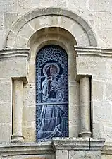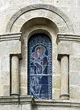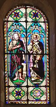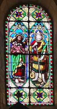 - Saint Jacques et saint Georges. Saint Jacques en pèlerin (côté gauche), saint Georges tient de la main droite une lance qui est plantée dans la gueule d'un dragon, la main gauche tient la palme du martyre (baie 15, côté droit).