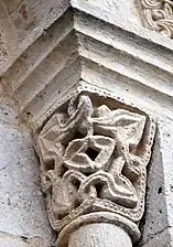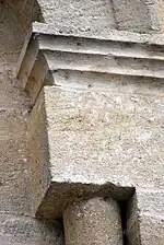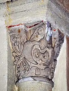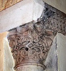 - Le tailloir du chapiteau est décoré avec un entrelacs simple de rinceaux et de feuilles.