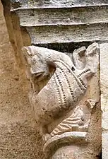 Baie N°2 : À gauche, on a une représentation du Porteur de poisson géant, qui est un classique des modillons romans en Aquitaine, pour rappeler le poids des péchés. À droite, la corbeille est couverte avec la représentation d'un équidé.
