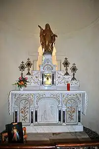 - La statue de l'enfant Jésus, couronné et revêtu d'un manteau, tient le globe dans sa main gauche, la main droite bénit. La statue, en plâtre peint, est inscrite[18] à l'I.G.P.C. et date du début du XXe siècle. Cette représentation de l'enfant Jésus est également appelée l'« enfant roi » ou l'« Enfant Jésus de Prague » en référence à la statue : Enfant Jésus de Prague, qui date du XVIIe siècle.