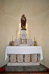 - Un ancien bénitier, utilisé aujourd'hui comme fonts baptismaux, date du XVIIe siècle ; il est inscrit[10] à l'Inventaire Général du Patrimoine Culturel. Le pied octogonal est surmonté d'une cuve octogonale, pourvue d'un trou d'écoulement, dont l'intérieur est circulaire (de 79 cm d'ouverture et de 92 cm de diamètre extérieur, hauteur de 65 cm).