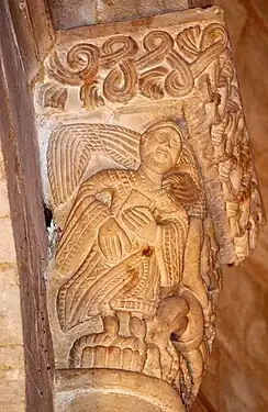 Sur l'autre petite face du chapiteau se trouve un ange, qui tient un livre dans la main gauche.