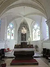 - Le retable du chevet, en bois taillé et peint, est de style baroque, et susceptible de dater du XVIIe siècle. Il occupe tout le pan axial de l'abside. Seulement la partie basse reste libre. On y trouve une niche murale servant de rangement pour les objets liturgiques avant la construction de la sacristie. L'autel de célébration, en forme de tombeau galbé, comporte également des placards accessibles de derrière. Avec son tabernacle, qui se présente comme un édicule baroque orné de colonnettes torsadées, il a été avancé à la suite de la réforme liturgique, bien que ne permettant pas la célébration « face au peuple ». Le retable est très plat. Il est destiné à servir d'écrin à un grand tableau au cadre cintré, qui n'existe toutefois plus, et a été troqué contre un plus petit tableau représentant le Christ en croix entre la Vierge de douleur et saint Jean. Le tableau est cantonné de deux paires de pilastres ioniques cannelés et ornés de perles, qui supportent des sections d'entablement garnies de fleurs sculptés en bas-relief, avec un rang de denticules et un rang d'oves et de dards dans l'échine de la corniche. Il existe un second registre, qui comporte au centre un panneau carré ajouré d'un grand oculus, qui ouvre la vue sur le vitrail de la Charité de Saint-Martin déjà signalé ci-dessus. Le panneau est flanqué de deux ailerons et sommé d'un fronton cintré, où se profile une tête de chérubin au-dessus d'un collier d'ailes, tandis que des chutes de fleurs retombent à gauche et à droite.
