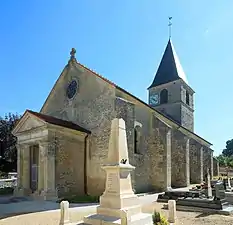 Construite en moellon, pierre de taille, et revêtement l’église est de plan allongé à nef unique voutée d’ogive avec chevet à fond plat percé d'une fenêtre unique. Les toits à longs pans sont couverts de tuiles plates et d’ardoise. Le clocher massif à flèche carrée est situé au dessus du chœur avec un escalier à vis hors-œuvre sur son côté nord[1]. Le portail d'entrée situé en pignon ouest est précédé d'un porche dorique ajouté à la fin du XVIIIe siècle.