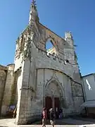 L'aspect tourmenté et complexe de l'édifice actuel, dominé par les ruines gothiques du transept, témoigne de son histoire mouvementée. Les parties les plus anciennes datent du XVe siècle : il s'agit des murs des deux croisillons du transept, encore en élévation, dotés d'un chemin de ronde et dotés de leurs portails à la statuaire mutilée. Subsistent également de l'édifice médiéval les chapelles de l'actuel chœur (qui était en fait la nef de l'édifice) et celles du bas-côté sud. On peut également voir une fenêtre de style flamboyant et aujourd'hui obstruée sur le mur gouttereau nord.