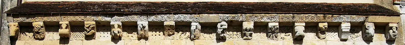 Il y a deux séries de modillons : seize au-dessus le portail et trente-quatre autour du chevet.