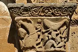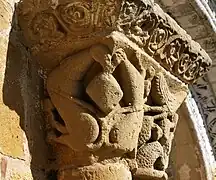 Le chapiteau est bi-facial. Il y a deux couples d'oiseaux adossés qui détournent leurs becs pour picorer une pigne (fruit de vie). Deux des oiseaux sont entiers et on peut voir que leurs pattes serrent des fruits sphériques, le fruit défendu ou malum et attribut de Satan. Ces oiseaux sont donc malfaisants.