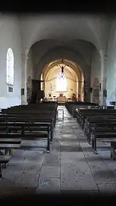 Église romane à nef unique et chœur à fond plat percé d'une belle verrière et orné de fresques représentant les apôtres au-dessus des croix de consécration.