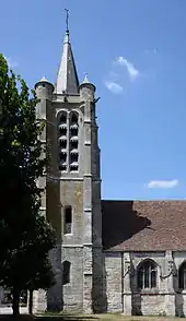 Le clocher est scandé horizontalement par deux niveaux de glacis formant larmiers, qui marquent la limite entre le rez-de-chaussée et le premier étage, et entre celui-ci et l'étage de beffroi. Un bandeau mouluré d'un profil plus complexe est réservé au sommet de l'étage de beffroi. Le rez-de-chaussée comporte une porte en anse de panier surmontée d'une fenêtre en tiers-point au remplage de deux lancettes côté ouest, déjà mentionnées, et une fenêtre en arc brisé assez étroite côté sud. L'étage est percé d'une fenêtre en anse de panier entourée de moulures prismatiques à l'ouest, aujourd'hui bouchée, et d'une fenêtre identique côté sud. L'étage de beffroi est ajouré de deux baies abat-son géminées par face, qui sont décorées d'un bandeau mouluré retombant sur des culs-de-lampe. Les trumeaux sont garnis d'une colonnette appareillée, dernière concession aux clochers gothiques classiques de la région. Chaque angle de la tour est épaulé par deux contreforts orthogonaux, qui présentent, au milieu des deux premiers niveaux, un larmier sur leur face extérieure. L'étage de beffroi étant plus élevé, les larmiers se situent ici à un tiers de la hauteur. À deux tiers de la hauteur, l'on trouve des larmiers accompagné d'une retraite. Sinon, glacis et larmiers sont analogues aux parties de l'église appartenant à la première campagne de construction. Les deux contreforts à l'angle sud-ouest dissimulent une tourelle d'escalier ronde, qui contribue en même temps à la solidité de la tour. D'après Arnaud de Saint-Salvy, elle contient cent-trente-quatre marches[8]. La tourelle d'escalier se termine par une échauguette au niveau de la plate-forme au sommet de la tour, qui est délimitée par un simple mur et non par une balustrade.