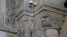Les modillons de la corniche sont très variés avec des têtes humaines, des masques d'animaux, des motifs géométriques, un griffon ailé, un âne, un porc, un sagittaire, un personnage près d'un lion.