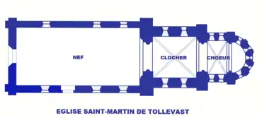 L'église Saint-Martin de Tollevast, qui présente un plan basilical élémentaire avec une nef unique et un chevet en hémicycle[3], conserve, malgré les remaniements et la reconstruction du mur sud en 1757 et le clocher roman remplacé au XIIIe siècle, des portions très caractéristiques du deuxième quart du XIIe siècle.