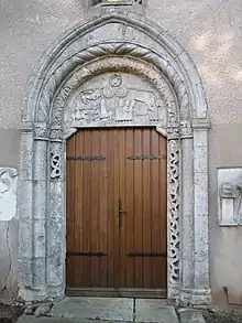 La porte de l'église est ornée d'un portail roman d'une facture assez naïve représentant les saintes femmes au tombeau (Mat. 28, 1-8 ; Mar. 16, 1-8 ; Luc 24, 1-11 ; Jean 20, 1)