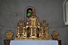 L’autel en bois, en forme de tombeau, est surmonté d’un tabernacle en bois doré à décor de palmettes. Il supporte la statue de la Vierge à l’Enfant.
