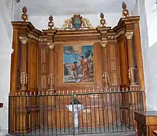 - Le retable imposant en bois naturel se compose de quatre colonnes corinthiennes cannelées et rudentées aux deux-tiers supérieurs. Elles soutiennent une épaisse corniche supportant au droit des colonnes des pots à feu et au centre un médaillon marqué du chiffre JHS. Les chapiteaux, les guirlandes et les rinceaux sont rehaussés de dorure.