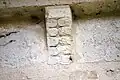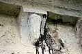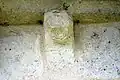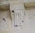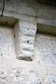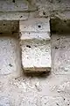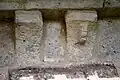 Les trois modillons sont érodés, mais on peut identifier un animal, peut-être un bouc et une tête humaine.