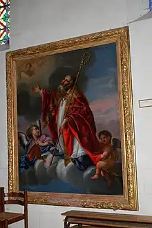 - Un tableau, daté de 1720 et œuvre du peintre toulonnais Sibon, représente saint Roch, qui montre son bubon de peste, accompagné du chien tenant le pain dans sa gueule. Le tableau est encadré par deux statues en bois. Celle de droite représente aussi saint Roch (dont le bubon a changé de jambe par rapport au tableau) et celle à gauche représente saint Boniface Le retable et statue de saint Roch sont classés[8] en 1969.