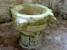 - Les fonts baptismaux sont en pierre calcaire, et se présentent sous la forme d'une cuve baptismale à infusion. Le pied est un épais fût cylindrique, sans base, à moins que celle-ci ne soit noyée dans le sol. Il ne mesure que 50 cm de hauteur. La cuve est de plan rond, de 85 cm de diamètre extérieur, et décorée, en-dessous de la bordure, d'une frise de feuilles de lierre. Elle est cantonnée de quatre éléments en forte saillie, dont l'état de dégradation ne permet plus d'identifier les motifs de leur sculpture. Il devrait s'agir d'une sorte de chapiteau, et la cuve devait être flanquée de colonnettes, comme à Glaignes et Pondron. Les chapiteaux représentent des monstres ou des oiseaux fantastiques, dont des hippogriffes et des dragons. Quelques ragréages ont été effectués au ciment. Le décor et la forme rendent possible une datation du XIIIe siècle. Cependant, l'abbé Beaudry attire l'attention sur le fait que des fonts baptismaux semblables ont été confectionnés pendant plusieurs siècles, à compter du XIIe siècle[20],[21].