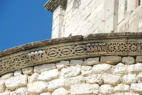 L'abside occidentale est entièrement réalisée en moellons et est surmontée d'une élégante frise romane ponctuée de faux modillons ornés de feuilles d'acanthe.