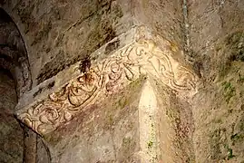 - Au dessus la porte-feint sud, la corniche est décorée avec des rinceaux et feuillage simples.
