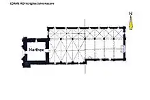- Dès l'entrée, on trouve un mur massif percé d'une porte haute et étroite qui, par cinq marches accède à la nef. Cet narthex est éclairé par deux fenêtres en plein-cintre : l'une ouvrant sur la façade, l'autre très étroite regardant le Nord. Il est recouvert à grande hauteur d'une voûte en ogive étoilée, réunissant ses nervures autour d'un trou à cloches.