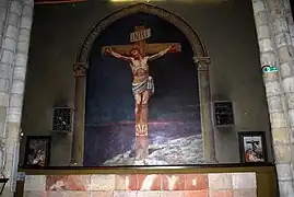 - Christ en croix : Cette sculpture en bois date, très probablement, du XVIIIe siècle. La tradition date ce Christ du XIIIe ou du XIVe siècle ; cependant, bien que le traitement du torse s'apparente à la sculpture gothique, les membres et surtout la tête, très idéalisée, paraissent de beaucoup postérieurs, œuvre d'un sculpteur archaïsant ou malhabile du XVIIIe siècle. Le Christ a en outre été restauré en 1931 par le sculpteur Lavaria. La croix est inscrite[18] à l'Inventaire général du patrimoine culturel le .