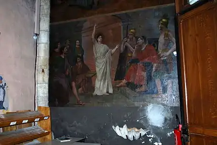 La scène évoquant sainte Catherine est à gauche de la porte d'entrée et celle de saint Sébastien à droite. Chaque tableau est divisé en deux panneaux : en haut, les scènes principales des mises à mort de Catherine et de Sébastien. Sous les scènes principales : à gauche, la controverse de sainte Catherine avec les docteurs d'Alexandrie ; à droite, saint Sébastien exhorte ses amis chrétiens. Les peintures sont inscrites[15] à l'Inventaire général du patrimoine culturel.