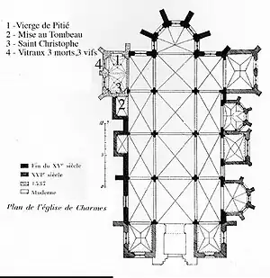 L’église paroissiale de Charmes (1493) a pour patron saint Nicolas dont le culte s’est développé en Lorraine dès le XIIe siècle[1].