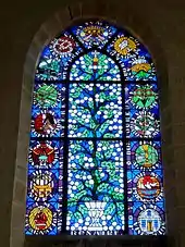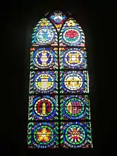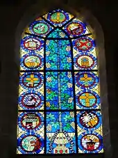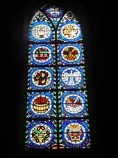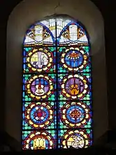 Le vitrail occidental de la nef, au-dessus de la tribune, n'est pas daté. Il est dédié aux instruments de musique généralement utilisés lors des offices religieux au XIXe siècle. L'on voit un orgue au sommet. Les huit médaillons représentent, du haut vers le bas et de gauche à droite : un trombone, un chapeau chinois, une guitare, un violon, lyre, des trompettes entrecroisés, un tambour (à l'envers), et un serpent[8].