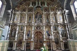 L'intérieur de l'église est caractéristique d'une certaine exubérance baroque[1],[3]. L'iconostase est sculptée de motifs végétaux et abrite quarante icônes représentant les saints et les fêtes religieuses ; elle pourrait avoir été peinte en 1814 par Jeftimije Popović[2], même si d'autres études en attribuent l'exécution à Stefan Gavrilović[1],[3]. Les fresques de l'autel et de la nef, quant à elles, sont dues à Pavle Simić et ont été réalisées en 1858[1],[2],[3],[N 2].
