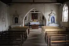 L'église se compose d'une nef à deux travées matérialisées extérieurement par des contreforts plaqués et d'un chœur sans transept. Nef et chœur sont séparés par un mur percé d'un arc en tiers-point[3].