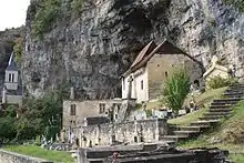 Cette église est singulière par sa taille très modeste et par sa situation, nichée au creux d'une anfractuosité de la falaise ; derrière la chapelle, la cavité est équipée d'un puits. Abandonnée dès la fin du XIXe siècle à cause de son état, une travée est alors annexée pour accueillir la cuisine du presbytère ; le reste de l'église se détériore jusqu'à sa fermeture pour des raisons de sécurité et une nouvelle église est construite au cœur du village[2]. Le retable a alors été vandalisé au cours du XXe siècle et paraissait irrémédiablement perdu quand une photographie faite par Armand Viré, estimée de 1910, a été retrouvée dans les archives du Lot. Dès lors une restauration a été entreprise permettant par un jeu de trompe-l'œil de restituer l'original[3].