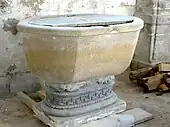 - Les fonts baptismaux en pierre se présentent comme une cuve baptismale à infusion, dont la forme évoque un navire. La largeur est de 128 cm, et la hauteur et la profondeur sont de 82 cm. La cuve est particulièrement haute, et le socle très bas. Son décor se compose d'éléments utilisés dans l'architecture de l'église, à savoir un rang de perles ; un rang de grecques ; et un rang de cercles entrelacés. La frise végétale en haut du socle est mal conservée. Christian Olivereau propose comme époque le XVIIe siècle ou le XVIIIe siècle, sans certitude et sans étude stylistique préalable[38].