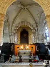 Les voûtes d'ogives des deux travées droites du chœur sont encore assez fortement bombées, mais sur l'unique mur (partiellement) plein, au sud de la croisée du transept, l'on trouve déjà un formeret. Il est constitué d'un rang de claveaux non moulurés, mais un tore se dégage près de la retombée côté ouest. Le reste a sans doute été gommé lors d'une réparation. Les ogives sont au profil d'une fine arête entre deux tores, comme déjà un peu plus tôt à Bury, Cambronne-lès-Clermont et Mogneville. Ce profil reste en usage jusqu'au début de la période gothique rayonnante. Comme généralement à la période romane, les clés de voûte sont de minuscules rosaces de feuillages, dont le diamètre est loin d'atteindre l'épaisseur des ogives. Les ogives retombent sur des colonnettes à chapiteaux implantées obliquement, et logées dans les angles des travées. Elles voisinent avec les fines colonnettes du formeret, ou des trois doubleaux vers le croisillon nord et les deux chapelles latérales de la seconde travée. Au moins le doubleau vers le croisillon nord est susceptible d'être contemporain du vaisseau central du chœur. Il y a un rouleau inférieur qui est traité à l'instar du rouleau supérieur des grandes arcades de la nef, avec les mêmes chapiteaux simulés. Dans la seconde travée, les doubleaux sont beaucoup plus sommaires. Le doubleau méridional comporte les vestiges d'un formeret torique, côté ouest. Le piédroit est très irrégulier de ce côté, et l'intrados est plat. Le doubleau septentrional conserve l'ancien formeret en son intégralité, et il y a un rang de claveaux inférieur non mouluré et seulement chanfreiné, ainsi que des tailloirs. Ils ne tiennent pas compte de la différence de plan entre les deux rangs de claveaux, et devraient résulter d'une reprise. Quant à l'abside, elle est dénuée de tout caractère. Le jour entre par seulement deux fenêtres, l'une au nord-est, et l'autre au sud-est. Eugène Müller a mesuré un rayon de l'hémicycle de seulement 1,30 m[10],[12].
