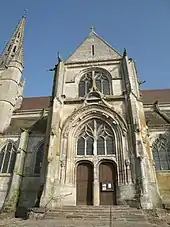 La façade du croisillon sud présente deux contreforts orthogonaux aux extrémités ouest et est, reliés par un mur galbé. Chacun est précédé d'une colonne engagée supportant un chapiteau, destiné initialement à recevoir une statue, comme l'indiquent également les vestiges de dais un peu plus haut. Un pinacle plaqué à la fin du niveau du rez-de-chaussée complète le décor ; au-delà, les angles des contreforts sont biseautés. Sur la face sud, des contreforts secondaires apparaissent au niveau de l'étage, se terminant également par de petits pinacles. Le portail est particulièrement remarquable. Il est cantonné de multiples supports fasciculés, sans chapiteaux, se continuant sans rupture autour de l'archivolte. Ce dernier est surmonté d'une accolade peuplée par huit petits animaux. Sur les piédroits, l'on note des pinacles, puis les restes de niches à statues, et encore des pinacles curbilignes sur la partie inférieure de l'archivolte. Plus haut, une frise de feuillages prend le relais, dont le début et la fin sont marqués par un petit animal. Le portail proprement dit se compose de deux portes en anse de panier de taille modeste, qui laissent la place à un grand tympan ajouré par une fenêtre à trois meneaux, avec un remplage flamboyant tardif : deux paires de deux lancettes sont chacune surmontée d'une accolade, entrecoupée par un quart-de-cercle et s'inscrivant dans un arc brisé. L'accolade du portail continue vers le haut et sert de meneau central à la fenêtre de l'étage, qui est en plein cintre, mais reproduit sinon le remplage du tympan. De petits animaux garnissent ici aussi l'extrados et les impostes. Enfin, une gargouille règne sur l'extrémité supérieure de chaque contrefort. Les faces latérales du croisillon sont elles aussi éclairées par des fenêtres, hautes et étroites, sans remplage. Une tourelle d'escalier occupe l'angle entre le croisillon et le chœur[5],[3].