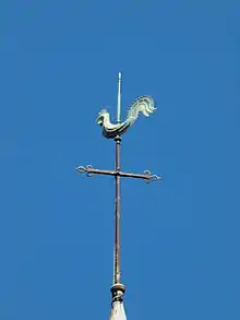 L’entrée principale se fait par le clocher-porche qui, comme son nom l’indique, a été construit en avant-corps. Massif, en pierres taillées, il a certainement eu un rôle défensif au cours de l’histoire. Peut-être lors des guerres de religion. Il est surmonté d’une girouette représentant un coq, symbole du peuple français.