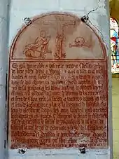 - La plaque décorative représentant le Christ en croix entre les deux larrons est en terre cuite moulée en demi-relief, peinte et vernissée. Elle mesure 40 cm de hauteur et 30 cm de largeur, et est datée de 1764. Le revers comporte une inscription (non publiée). La plaque est inscrite depuis 1991[32].