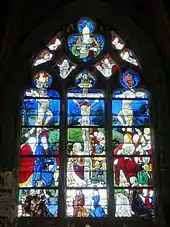 - Le vitrail dans le soufflet de la baie n° 3 ; les deux anges rouges dans les mouchettes, qui représentent des âmes ; et les deux personnages dans les losanges sont les seuls éléments anciens de cette verrière. La petite scène dans le soufflet représenterait l'Immaculée Conception, mais évoque plutôt l'Assomption. Les lancettes, postérieures à 1918, montrent, de gauche à droite, sainte Gabrielle, la Vierge à l'Enfant et sainte Laure[19].