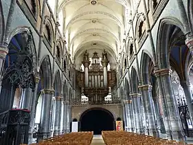 Niveaux de la collégiale : grandes arcades, triforium sans accès et fenêtres hautes.