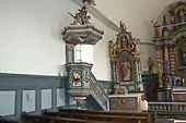 - Le mobilier religieux de style baroque est œuvre de l’ébéniste et sculpteur ardennais Jean-Georges Scholtus. Sculpté dans le chêne, il date de 1713-1724. Les quatre faces de la cuve de la chaire de vérité sont ornées de figures des quatre Évangélistes, tandis que son abat-voix est surmonté d’une statue de l’archange saint Michel terrassant le démon.