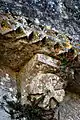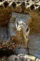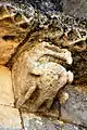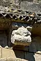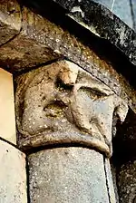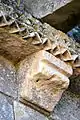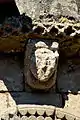 - 3 Le seul modillon non-figuré porte un décor de feuilles et de lianes qui forment une pyramide, comme le classique 'point de diamant'.