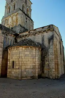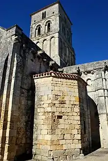 À l'extérieur, on regardera plus particulièrement le chevet doté d'une arcature haute, à la manière de celui de Saint-Eutrope de Saintes, les murs du bras nord du transept décorés de pierres disposées en zigzag, le clocher à trois niveaux d'arcatures et de baies,