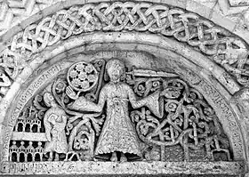- la partie extérieure de la voussure extérieure est décorée avec une chaîne formée de losanges. La partie intérieure est décorée avec une série de figures humaines. À gauche, deux hommes vêtus de tuniques longues ; l'un des hommes a transpercé la tête d'un lion ou d'un monstre avec une lance, l'autre homme est dans un cartouche formé d'une tige qui se poursuit dans les autres voussoirs ; ensuite un griffon ou un aigle d'inspiration orientale emmêlé dans des lianes, suivi par les six apôtres animés d'un mouvement violent « encordés »[3] représentés d'une manière pictographique, tenant pour la plupart le Livre ou un objet entre ses mains. Au centre de la voussure, le Christ debout et bénissant, sa tête encadrée dans une mandorle, entre deux chérubins à triple paires d'ailes. En descendant vers la droite, après le chérubin, six autres apôtres, puis encore un griffon ou un aigle dans des lianes et, pour terminer, une Vierge à l'Enfant (?).