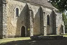 Deux fenêtres cintrées sont taillées dans le pignon de la façade ouest autrement sans fioritures. Le portail occidental est du XIIe siècle. Il est entouré d'archivoltes et encadré de deux colonnes ornées de chapiteaux à volutes. Un personnage aux bras levés est représenté sur le chapiteau gauche et des grimaces sont visibles sur le chapiteau droit.