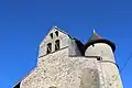 La façade de l'église soutenue par deux contreforts, flanquée d'une tour à sa droite.