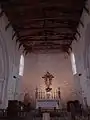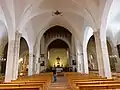 L'architecture atypique de cette église s'explique par des influences stylistiques différentes, passant du baroque et du classique au néo-gothique. Formant une croix latine, l'église est composée d'une nef divisée en trois travées, couvertes de voûtes ogivales (en dehors de la première travée, couverte d'une voûte lambrissée) reposant sur des colonnes portant des chapiteaux corinthiens ou sur des piles rectangulaires, d'un transept saillant et d'une abside rectangulaire en moyen appareil. De même que la croisée, l'abside est couverte d'une charpente évoquant un navire renversé. Le mur du chevet est aveugle et orné d'un christ crucifié d'inspiration baroque.