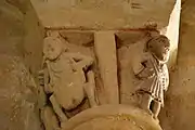 Trois personnages et un animal : Ce chapiteau est en partie englobé dans la maçonnerie du bas-côté, construit au XIVe siècle. Il est difficile d'interpréter la scène sans connaître le contenu de la représentation qui est cachée.