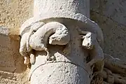 Les quatre lions : Le lion est, de très loin, la représentation animale la plus fréquente dans l'iconographie romane. Sur les chapiteaux, ils participent à des mises en scène complexes, à caractère symbolique et souvent moralisateur.
