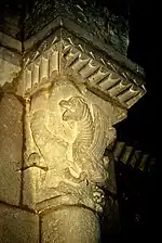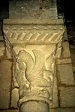 Sur chaque face du chapiteau, se trouve un « dragon ailé ». Celui de la face ouest a été martelé, il ne reste que sa silhouette. Par contre, les deux autres dragons sont complets. Celui de la face principale a la tête et la crinière d'un cheval, des écailles de poisson, la queue d'un serpent et des ailes. La créature sur la face orientale est très semblable, mais, avec sa langue fourchue, il lèche son aile. Il est accroché à l'astragale avec un pied griffu. Les trois dragons semblent plutôt jouer ensemble que combattre.