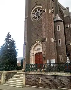 L'église à chevet plat, de style néo-gothique, est construite en brique. Un clocher-porche surmonté d'une flèche recouverte d'ardoises donne accès à une nef unique voûtée en bois. L'édifice conserve une chaire à prêcher et des statues de saints[1].